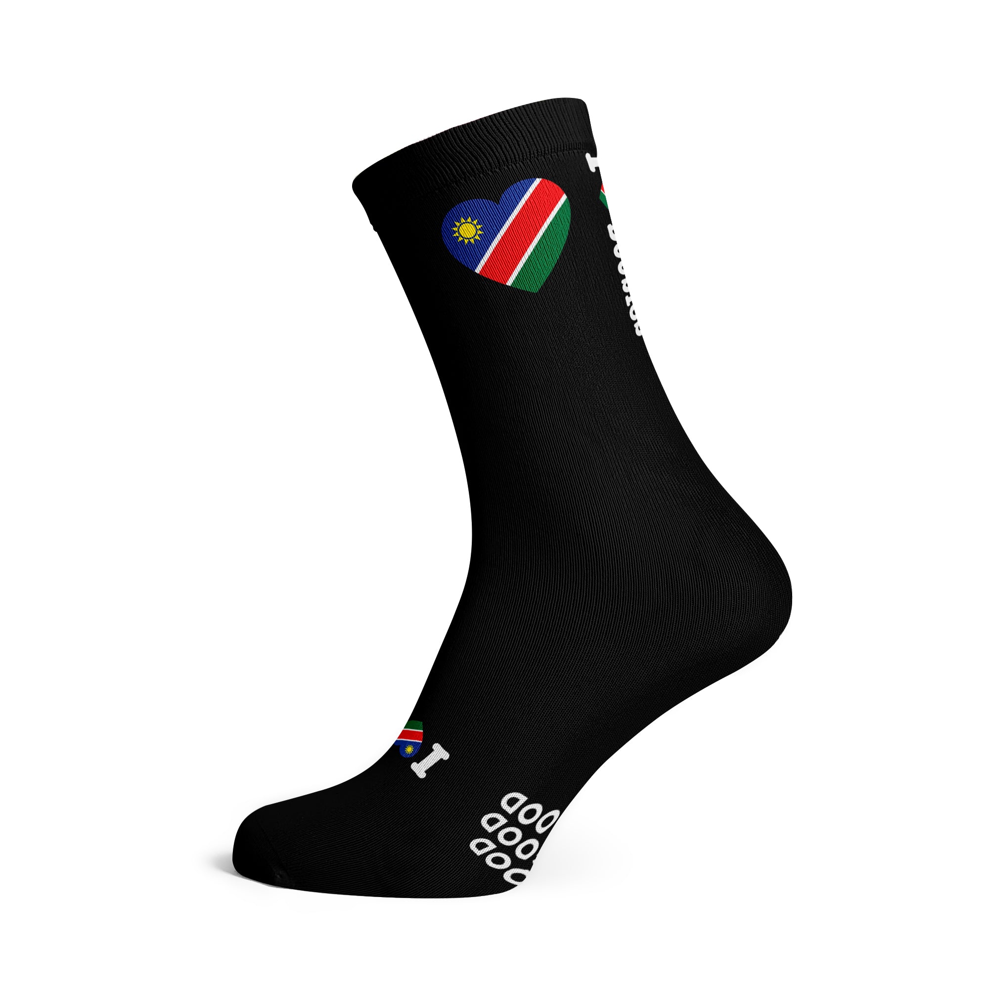 The ILoveBoobies Loves Namibia Crew Socks celebrate connection, community, and country. Designed in classic black with a bold heart featuring the Namibian flag, this sock is a tribute to the people, the spirit, and the strength of Namibia.