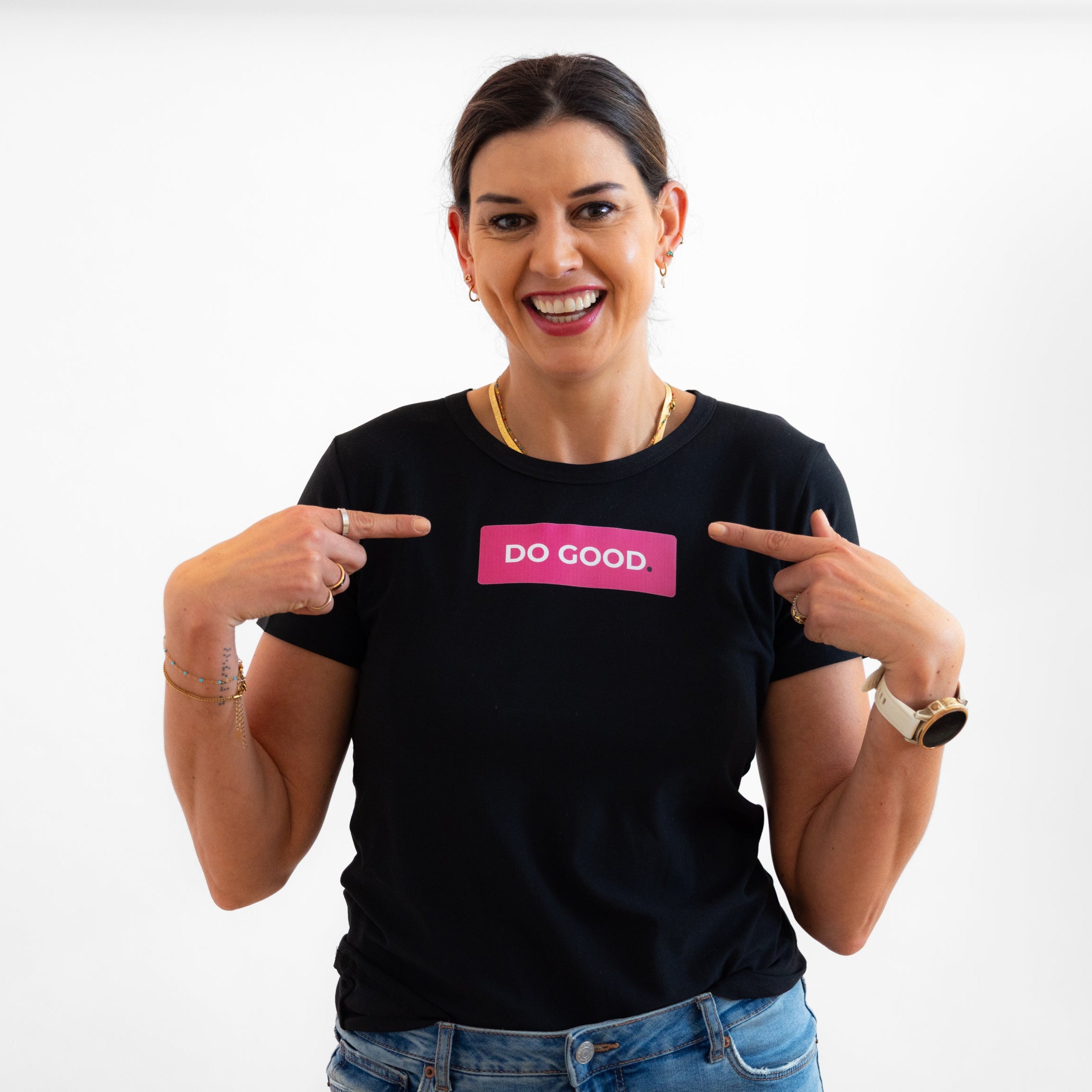 Where statement and flair meets purpose — our Black DO GOOD. T-Shirt is crafted from luxuriously soft brushed cotton for a premium, fashion-forward feel.