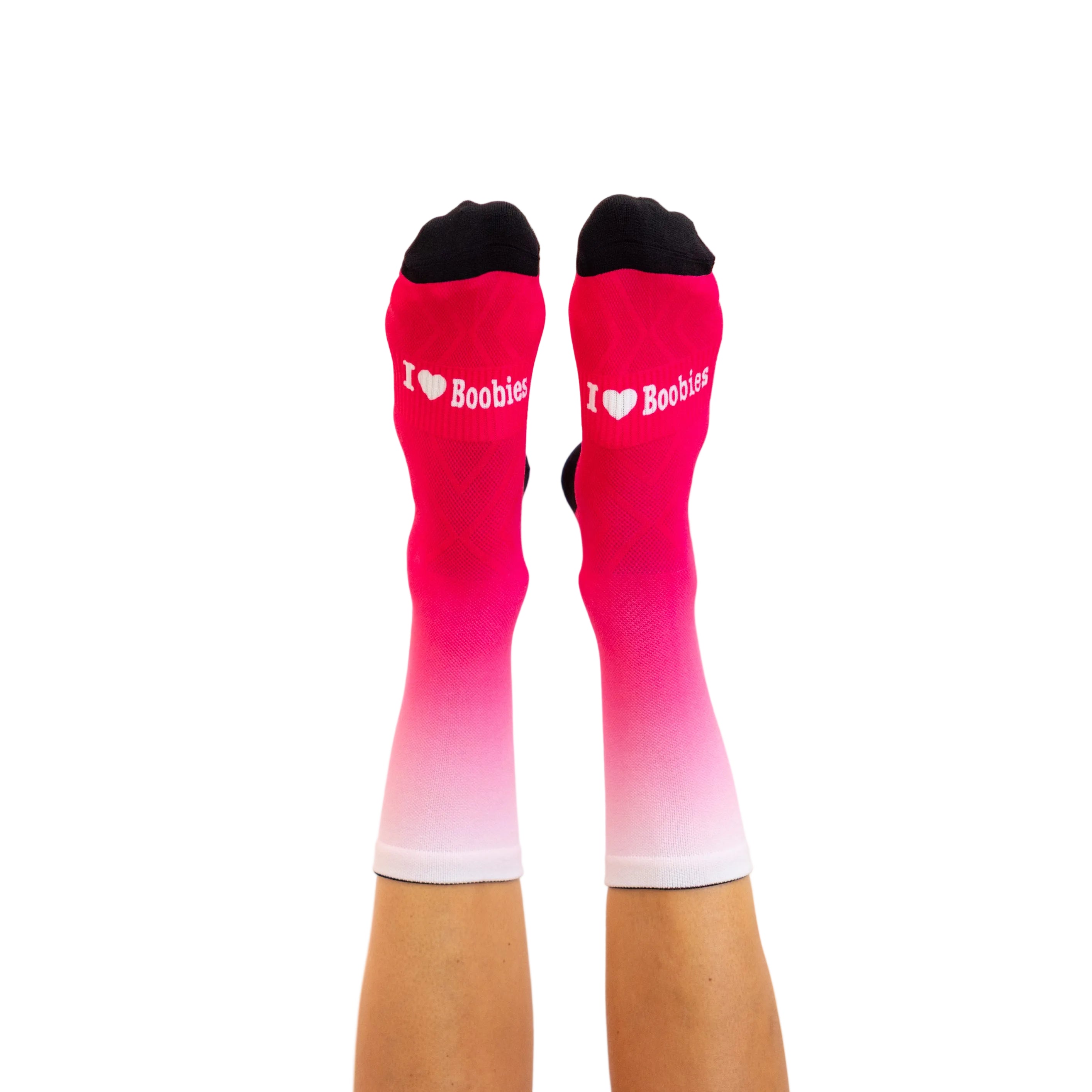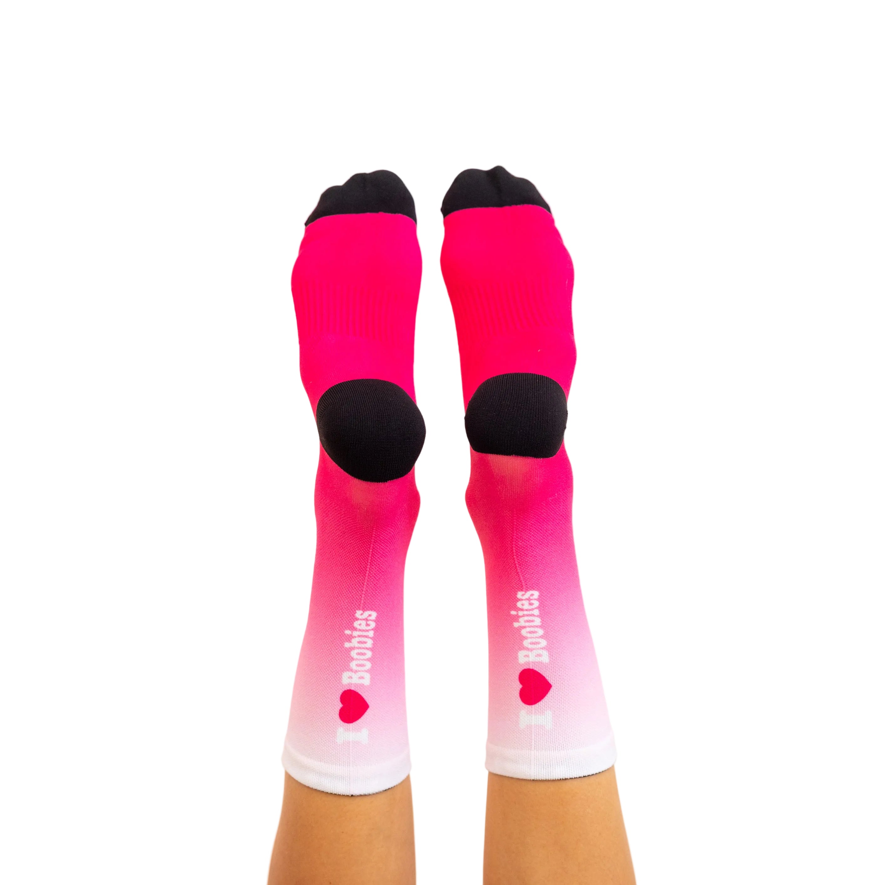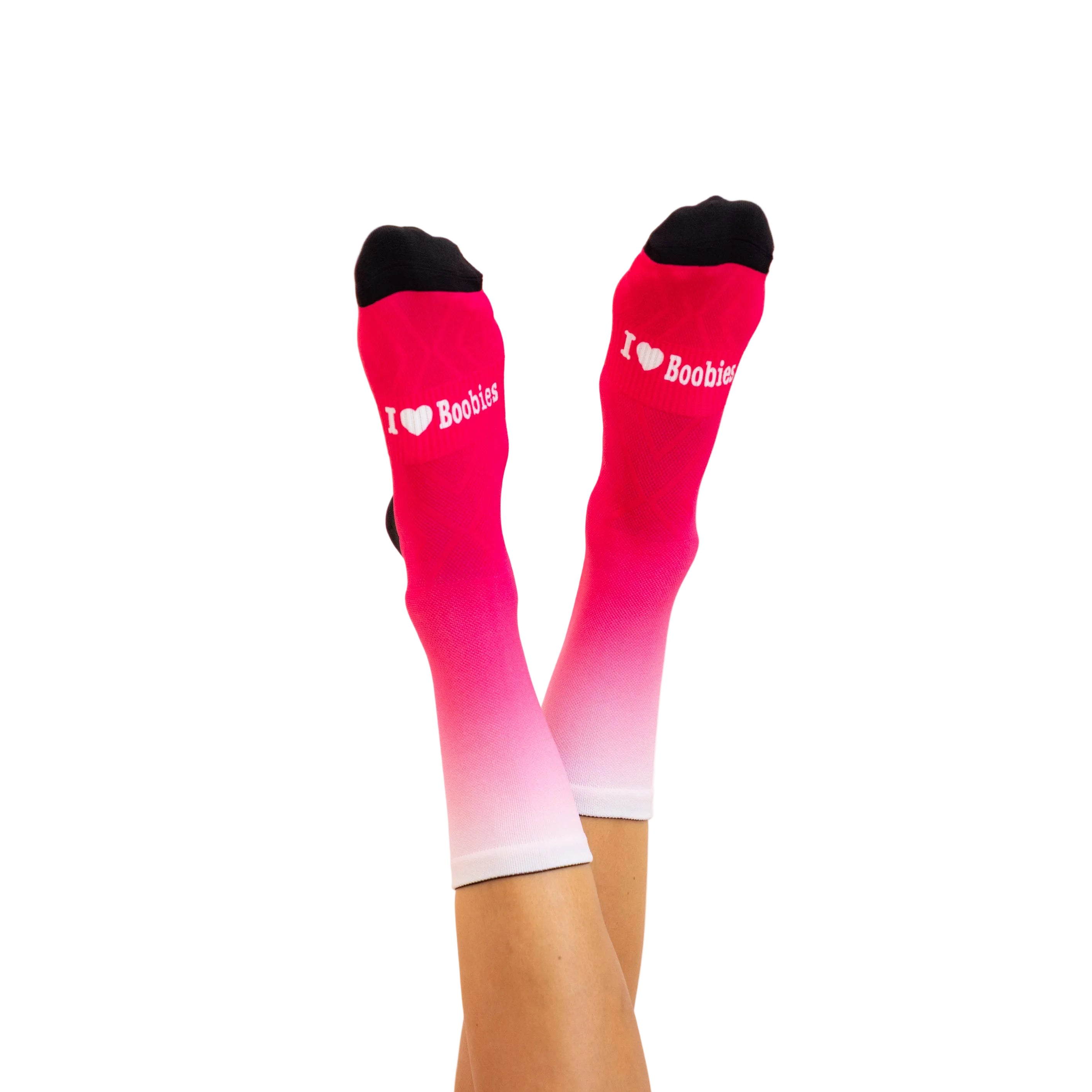 The length of a sock may be up for debate in the running and cycling world but there are no rules when it comes to the design. Our I Love Boobies Designer Socks are created to brighten up your kit ensemble, with a selection of colours and patterns to choose from. Made with a  nylon blend, the socks are lightweight, breathable and moisture wicking with a reinforced heel cup and toe box for added durability. 5 Pairs of socks equals to 1 breast cancer screening.