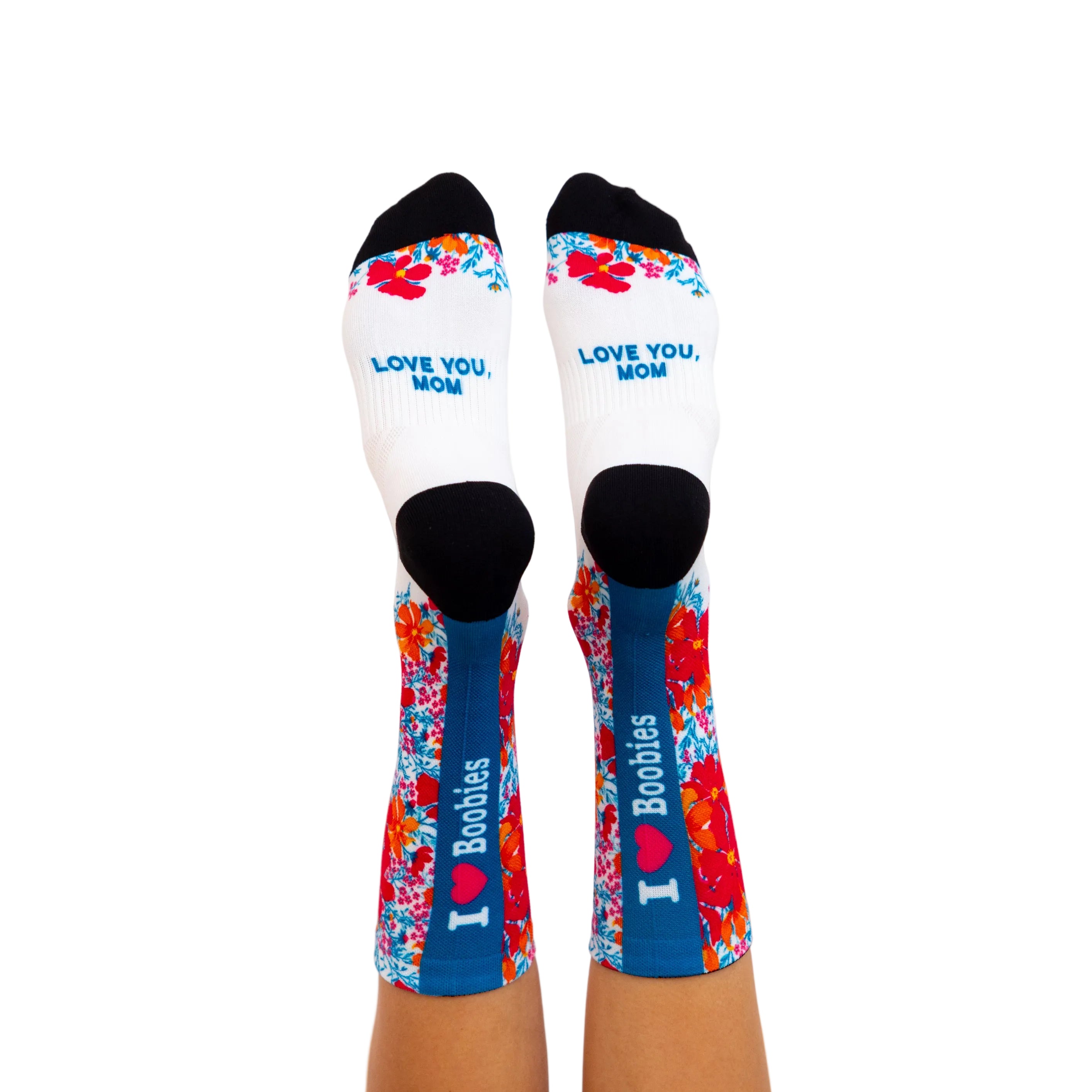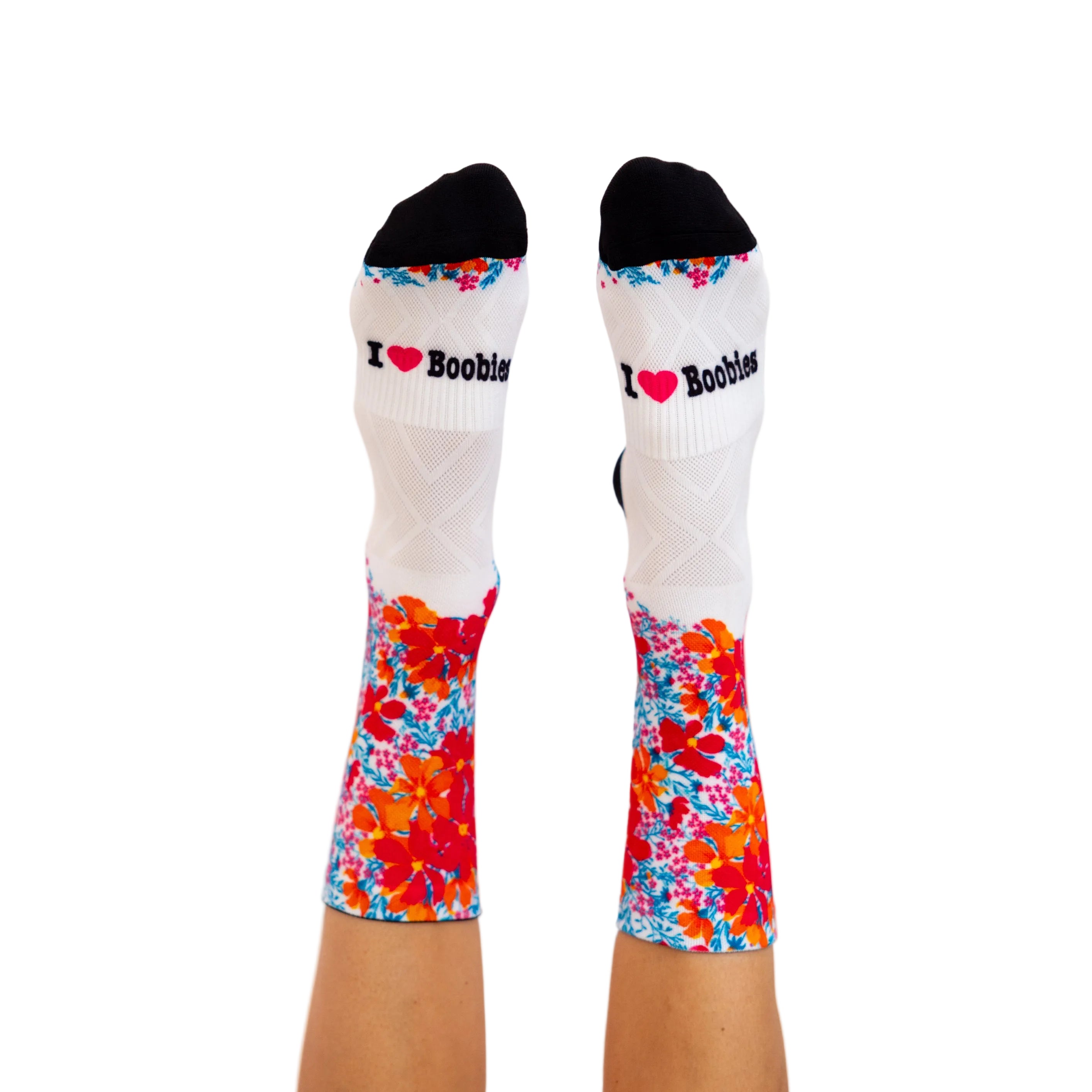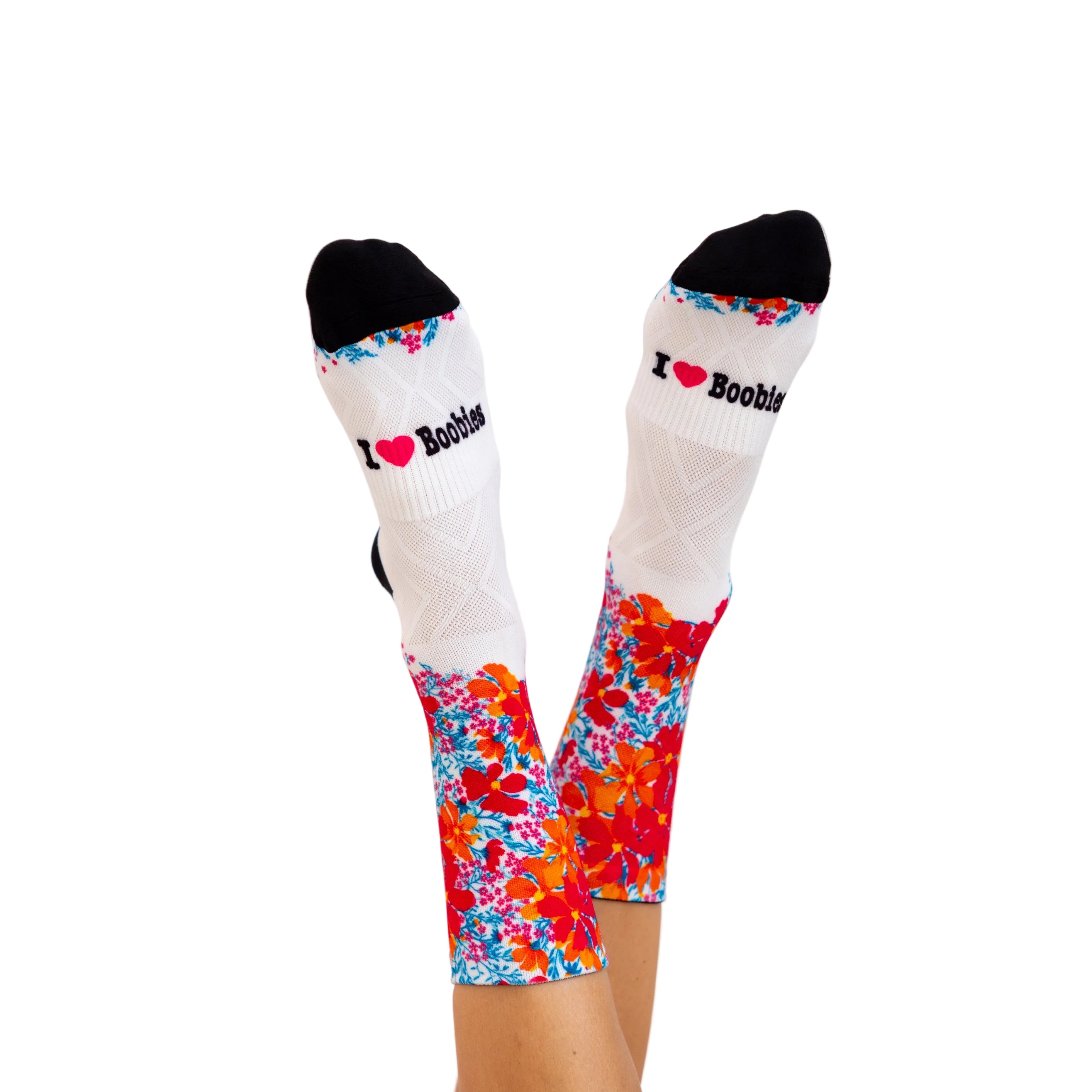 The length of a sock may be up for debate in the running and cycling world but there are no rules when it comes to the design. Our I Love Boobies Designer Socks are created to brighten up your kit ensemble, with a selection of colours and patterns to choose from. Made with a nylon blend, the socks are lightweight, breathable and moisture wicking with a reinforced heel cup and toe box for added durability. 5 Pairs of socks equals to 1 breast cancer screening.